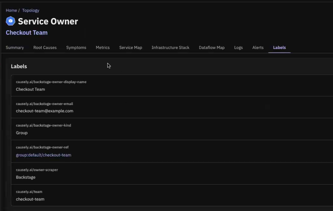 For teams using Backstage as the system of record, Causely surfaces who owns the service or component involved in an issue—reducing time to identify the right team during incidents.