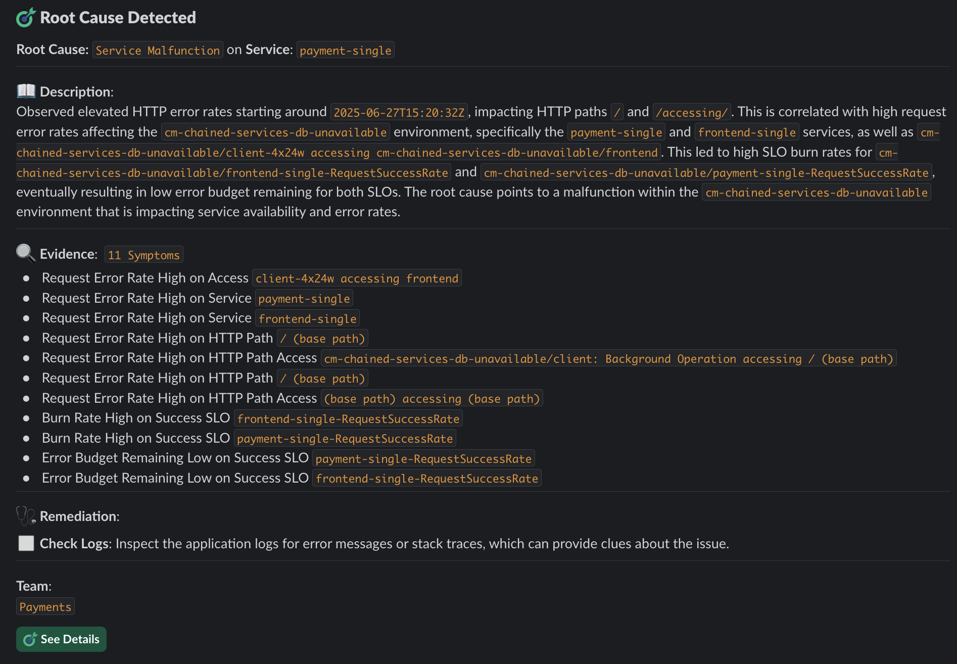 To receive root cause insights during incidents, configure a workflow integration such as Slack, Microsoft Teams, or Alertmanager. See the workflows overview for all available integrations.