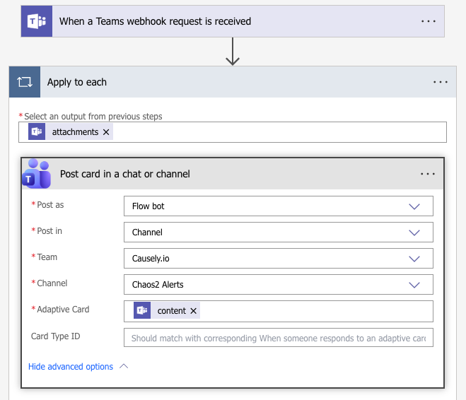The example below shows a completed Microsoft Teams Workflow with the webhook trigger, attachment handling, and channel post configured correctly.